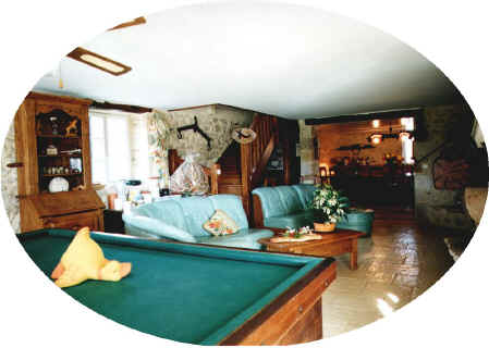 Dans le Mas, un grand salon avec télévision, livres, jeux divers, cheminée,